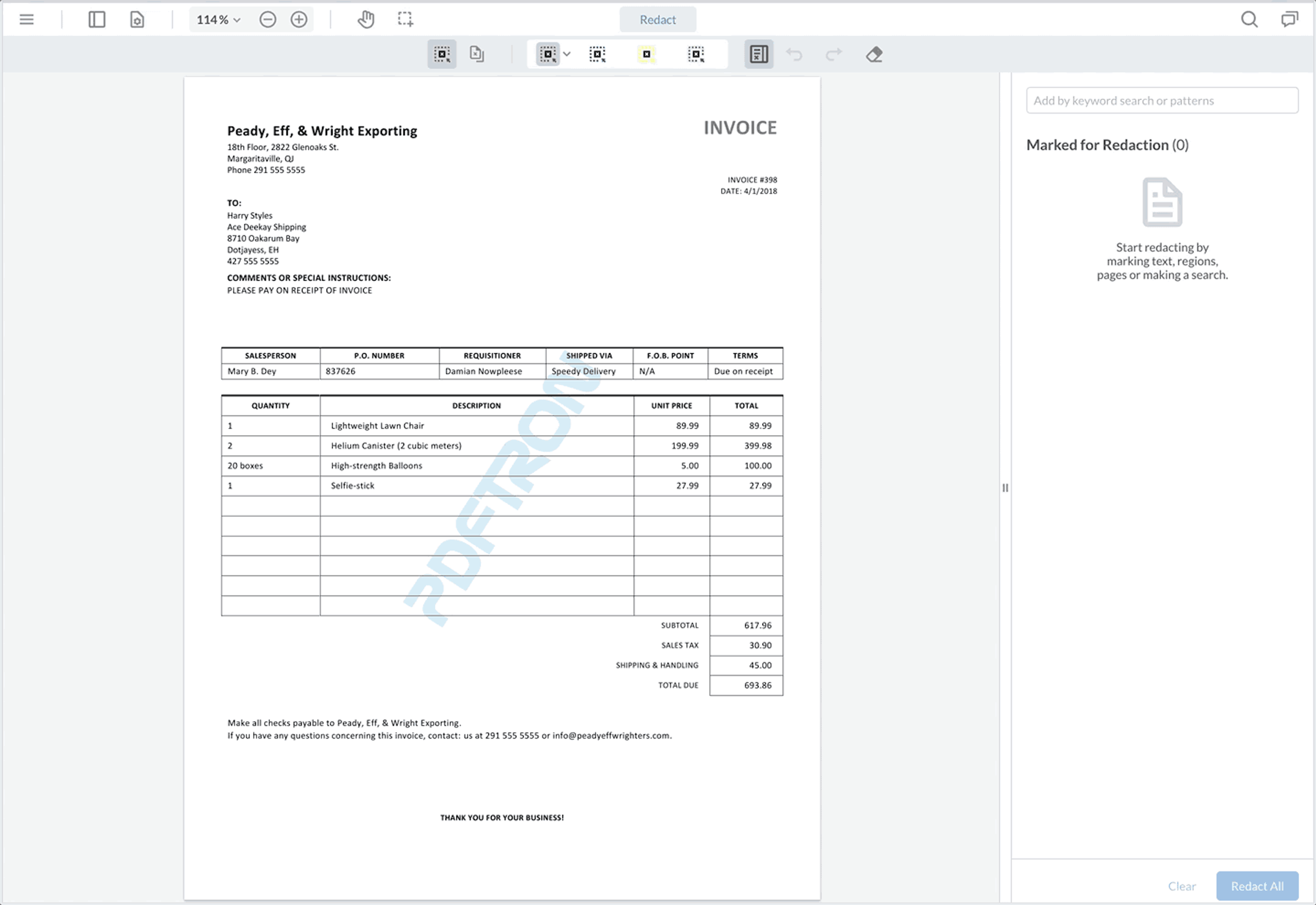 Next, combine WebViewer’s automated and manual searches to speed up redactions even more. Users can use the automated search to look for patterns such as phone numbers, credit cards, and emails, added to the list of draft redactions. They can also search for strings, such as names of the individuals listed on the document, and add those to the list as well.